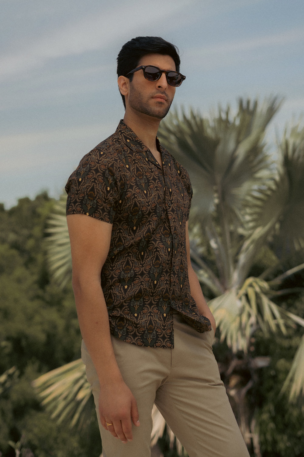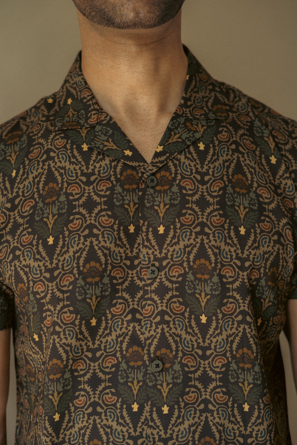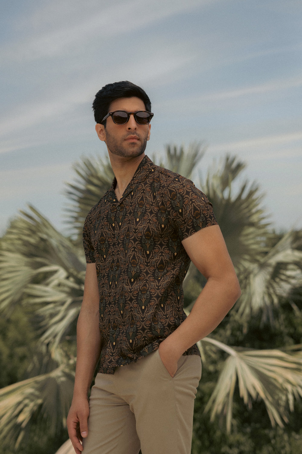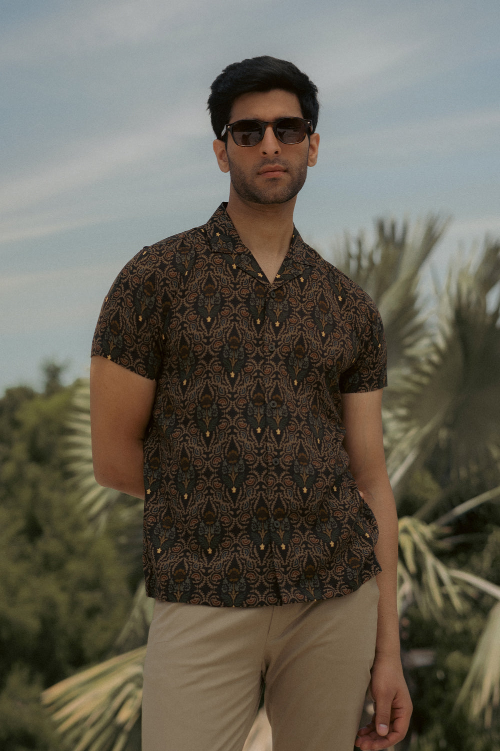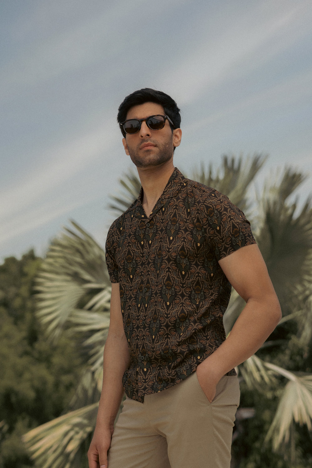 A brown rayon shirt featuring an all-over ornamental print composed of stylised floral and paisley-inspired motifs arranged in a rhythmic pattern. Designed with a relaxed camp collar and half upturned sleeves, the shirt offers an easy fluid silhouette enhanced by the soft drape of the rayon fabric perfect for summers.The intricate print brings a rich visual texture while maintaining a refined, everyday appeal.