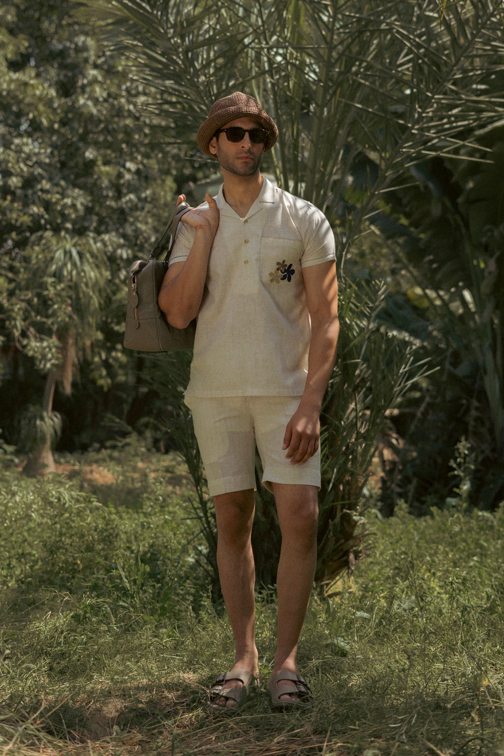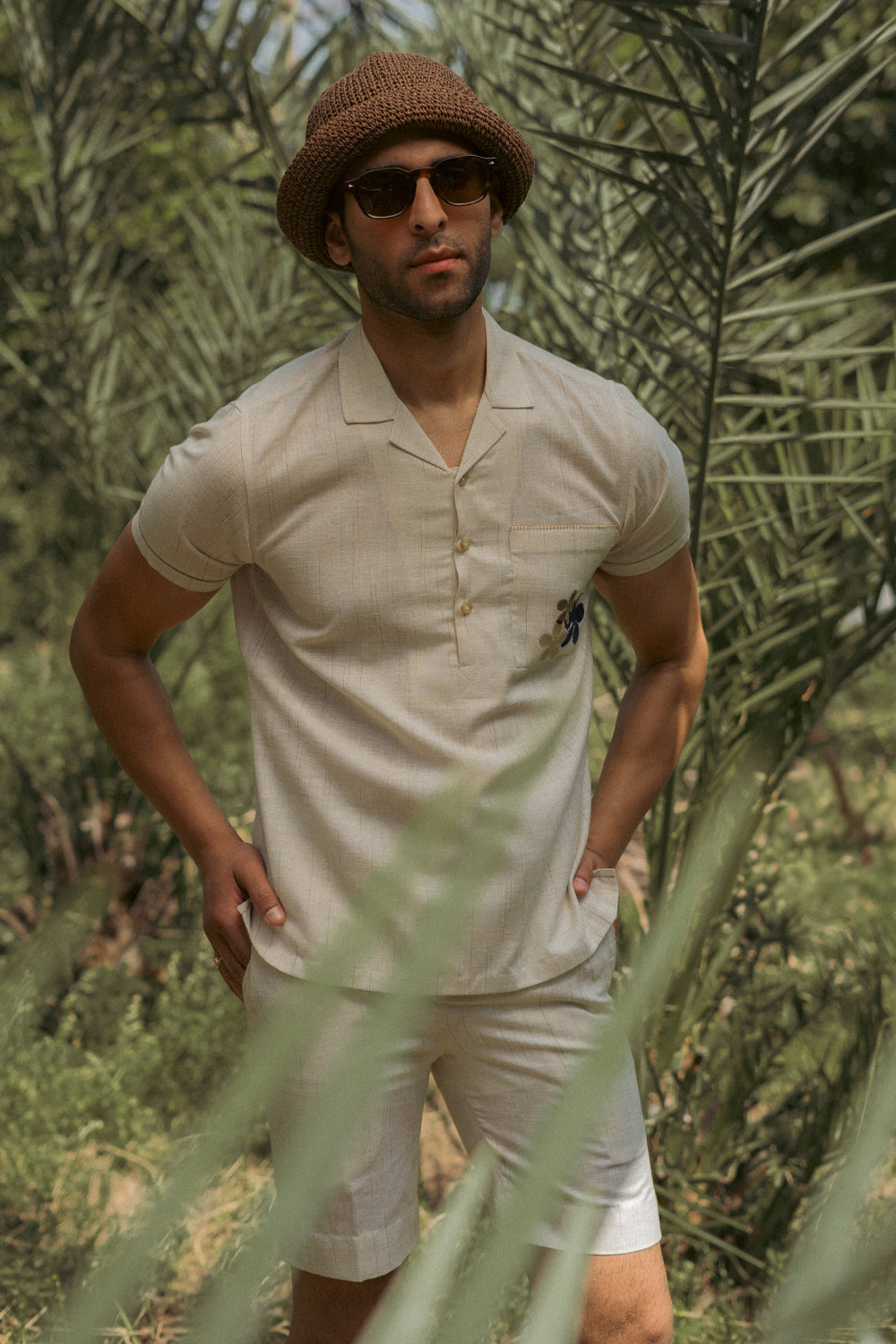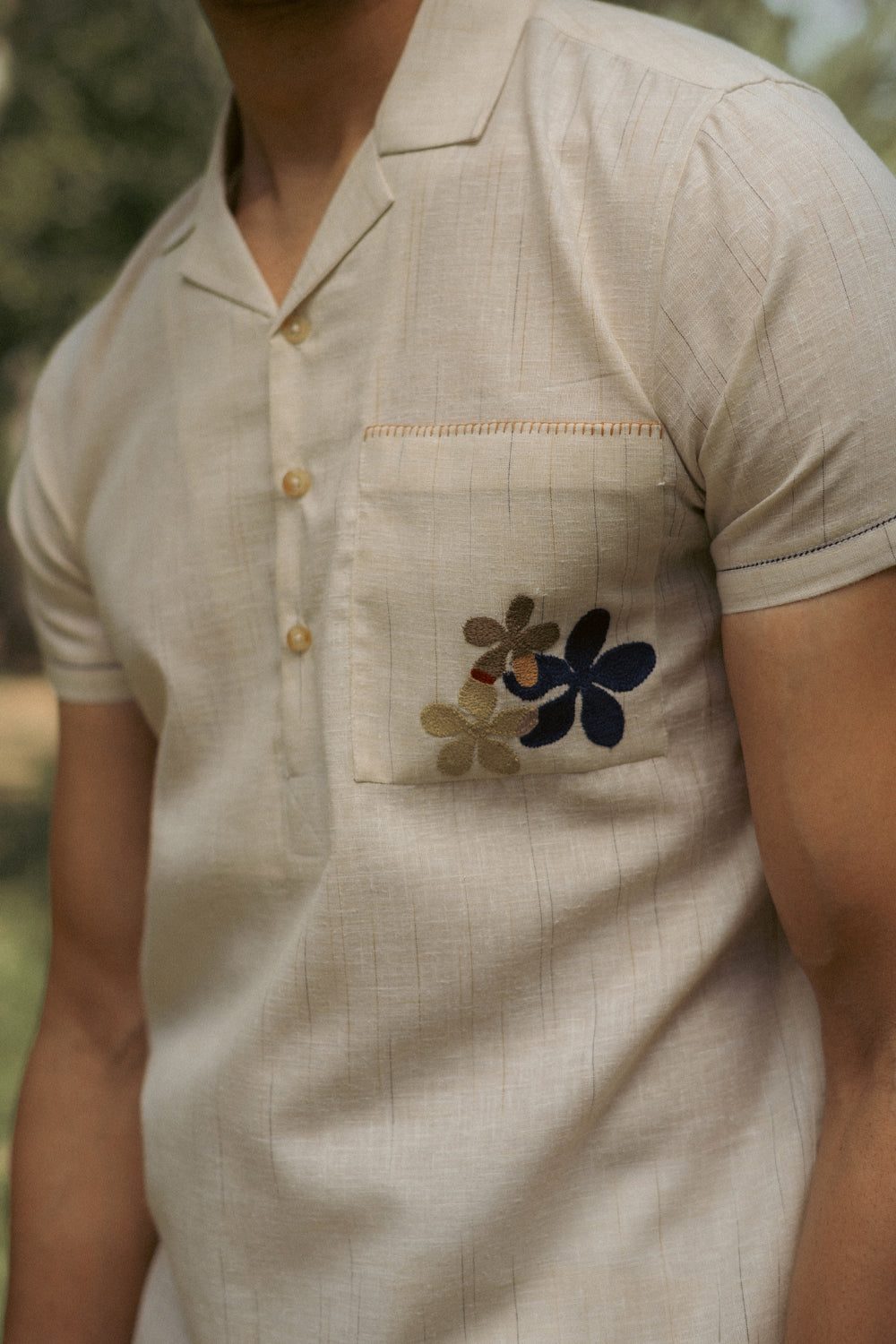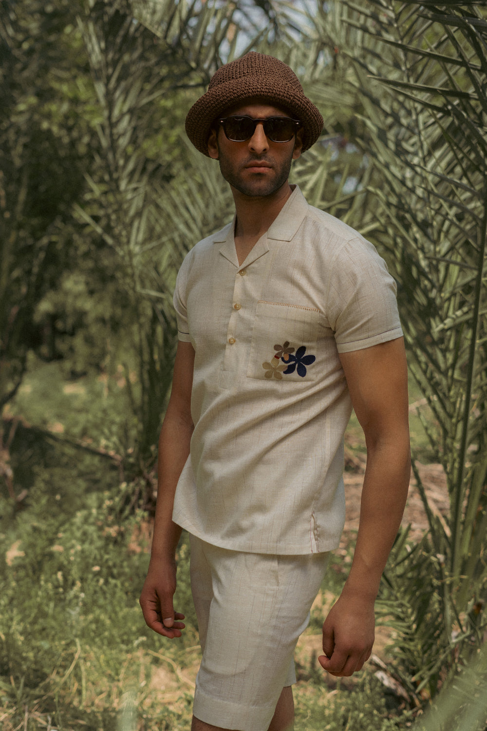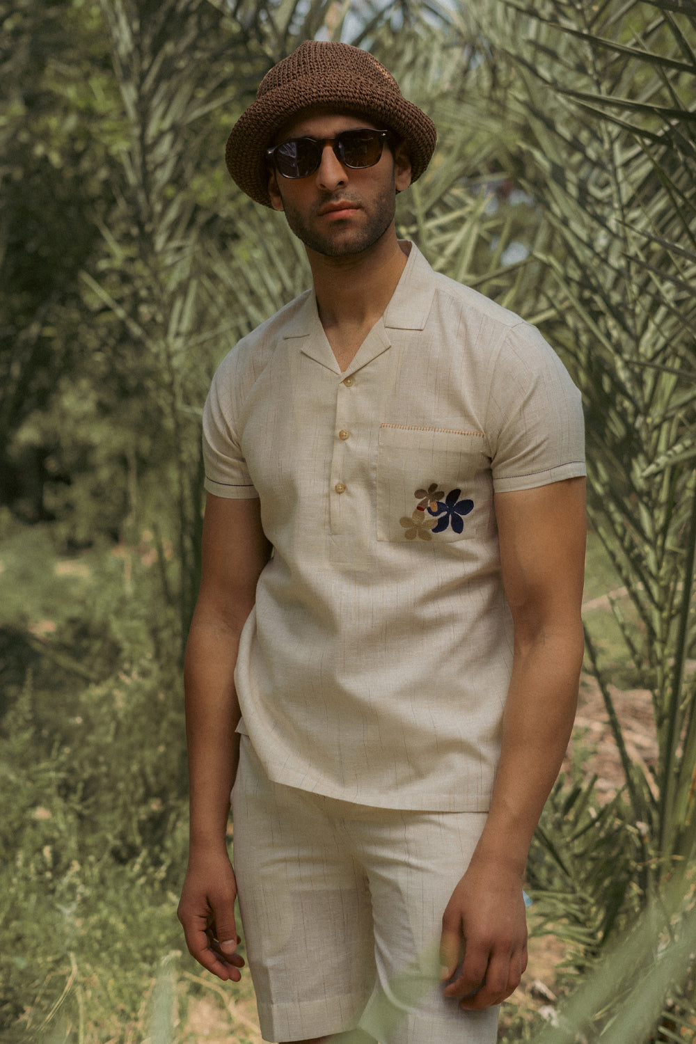 An ecru cotton–linen half sleeve Co-ord set designed with a relaxed camp collar and a half placket for an easy, laid-back silhouette. The shirt features a front pocket accented with delicate embroidery and finished with a blanket stitch along the top edge. Subtle fagotting details run along the sleeves, with a contrasting tone on each sleeve adding a quiet visual nuance. The shorts are half elasticated for easy comfort.