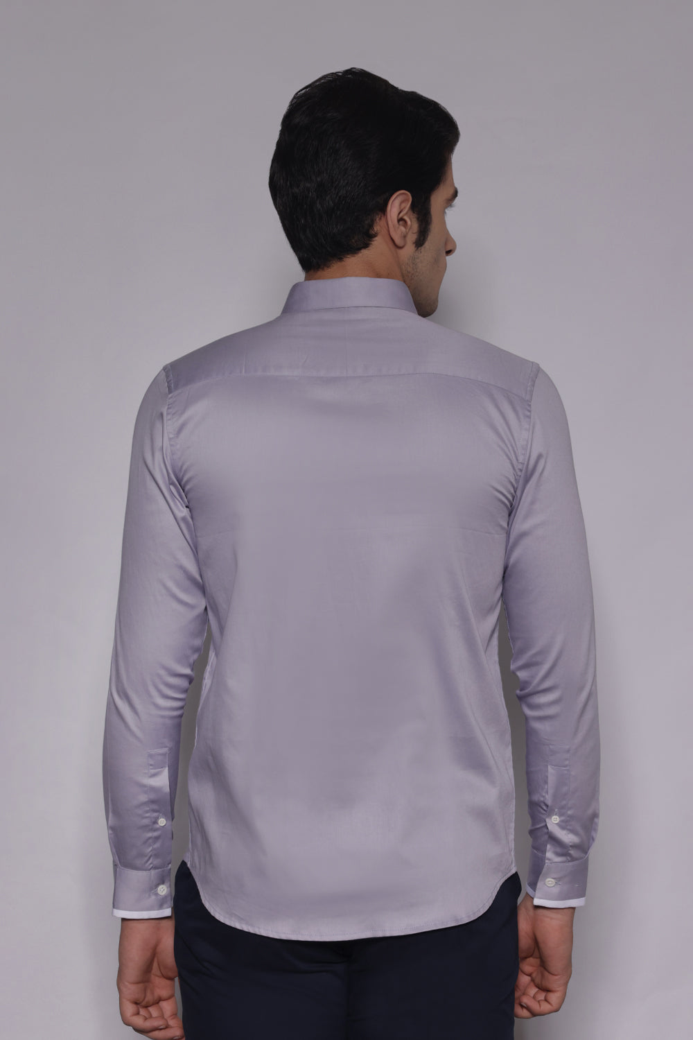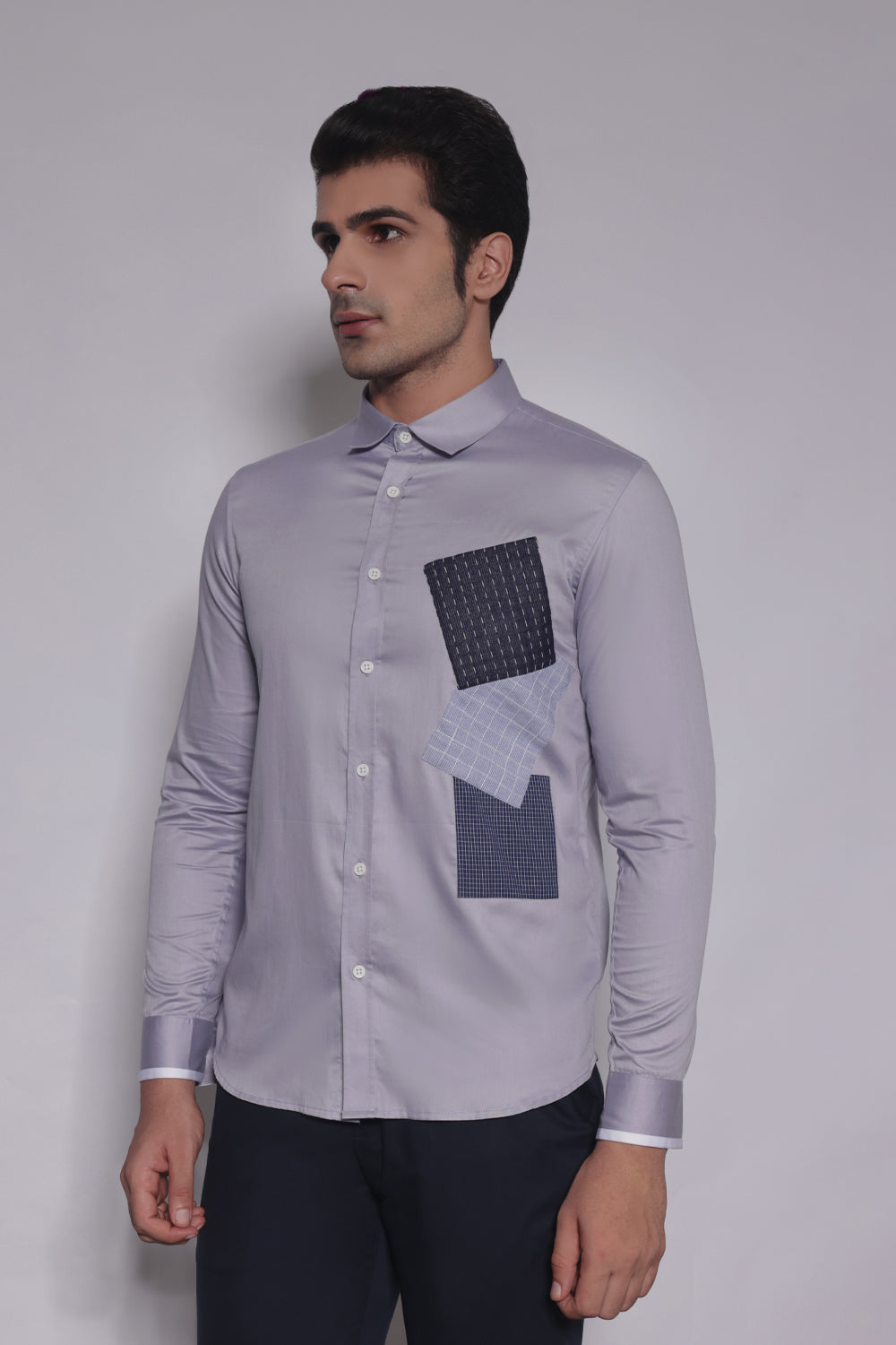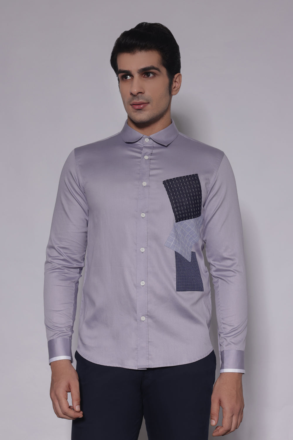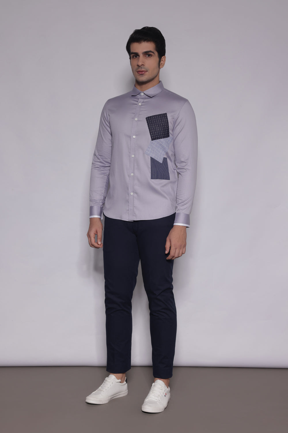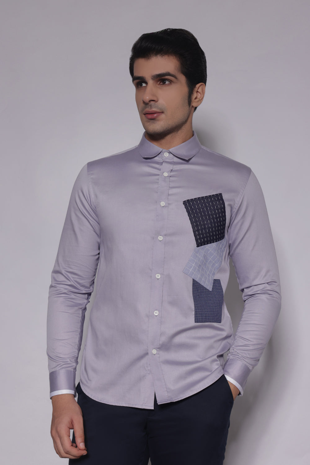 This refined shirt comes in a soft lilac cotton with the highlight of the piece being the asymmetrical colour-block patchwork on one side. It features embroidered and textured fabric panels in three tones of blue—adding depth ,dimension and a crafted artisanal touch. Clean white binding accents at the cuff bring added contrast detail to the shirt, while the classic placket with crisp white buttons keeps the design balanced and sophisticated.